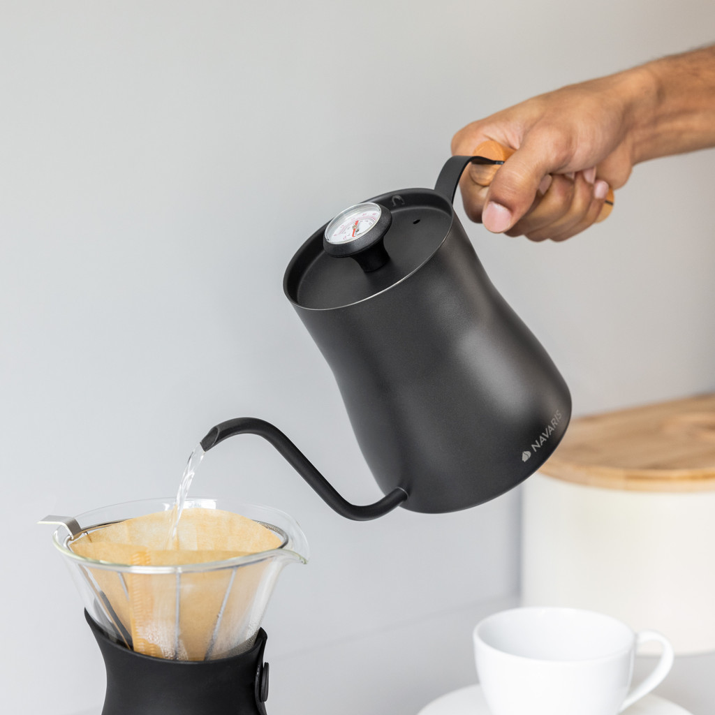 Fierbator cafea Navaris pour-over, 1000 ml, termometru integrat, argintiu, lemn/otel inoxidabil